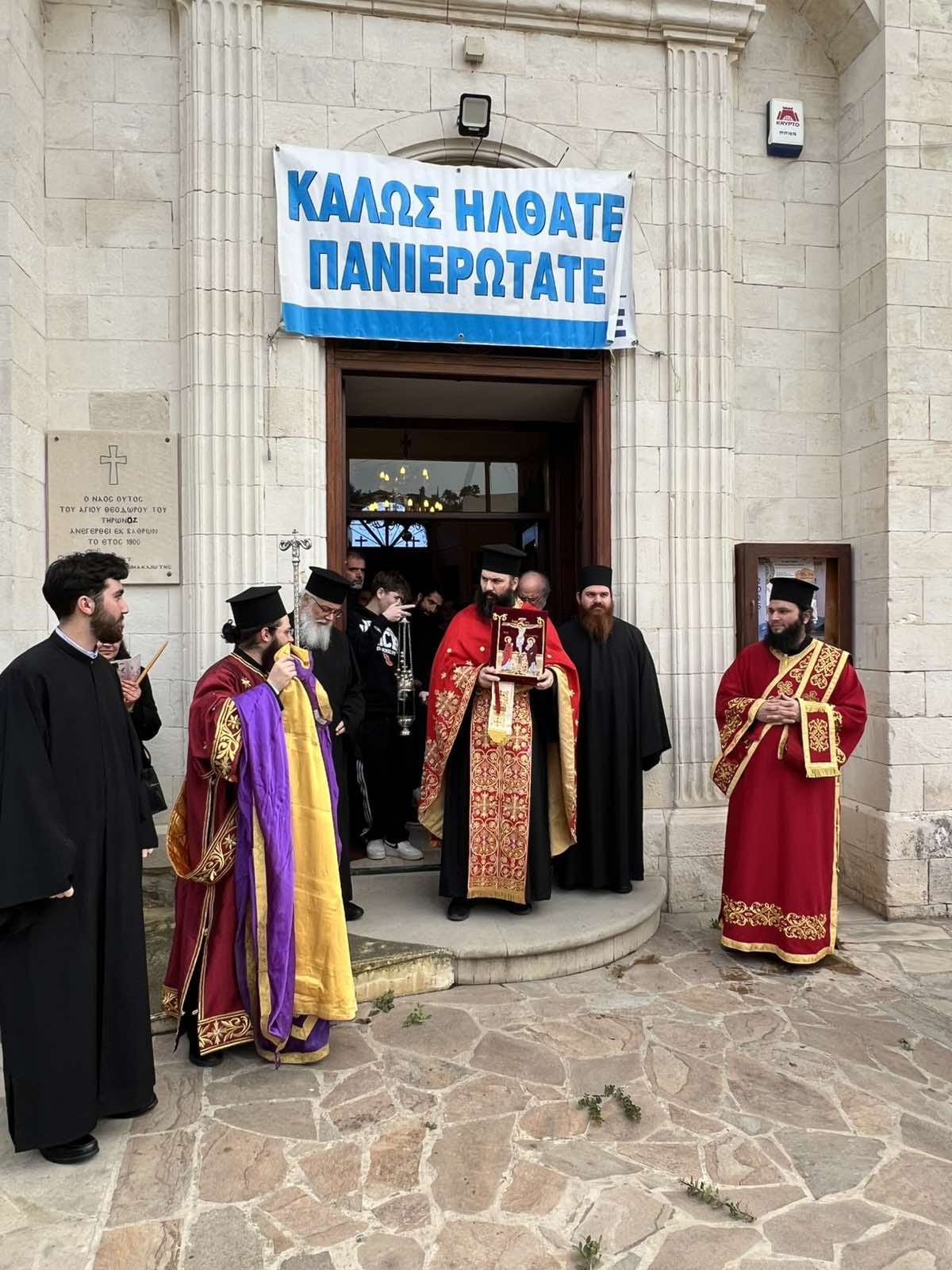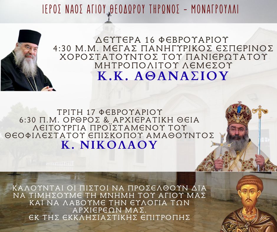 Τη Δευτέρα, 16 Φεβρουαρίου, τελέστηκε με ιδιαίτερη κατάνυξη ο Μέγας Εσπερινός του Αγίου Θεοδώρου του Τήρωνος, μέσα σε ατμόσφαιρα προσευχής και ευλάβειας. Η παρουσία του Πανιερωτάτου Μητροπολίτου Λεμεσού κ.κ. Ἀθανασίου προσέδωσε ξεχωριστή πνευματική χαρά στο εκκλησίασμα, καθώς με την πατρική του γαλήνη ενίσχυσε όλους όσοι προσήλθαν να τιμήσουν τον Άγιο.