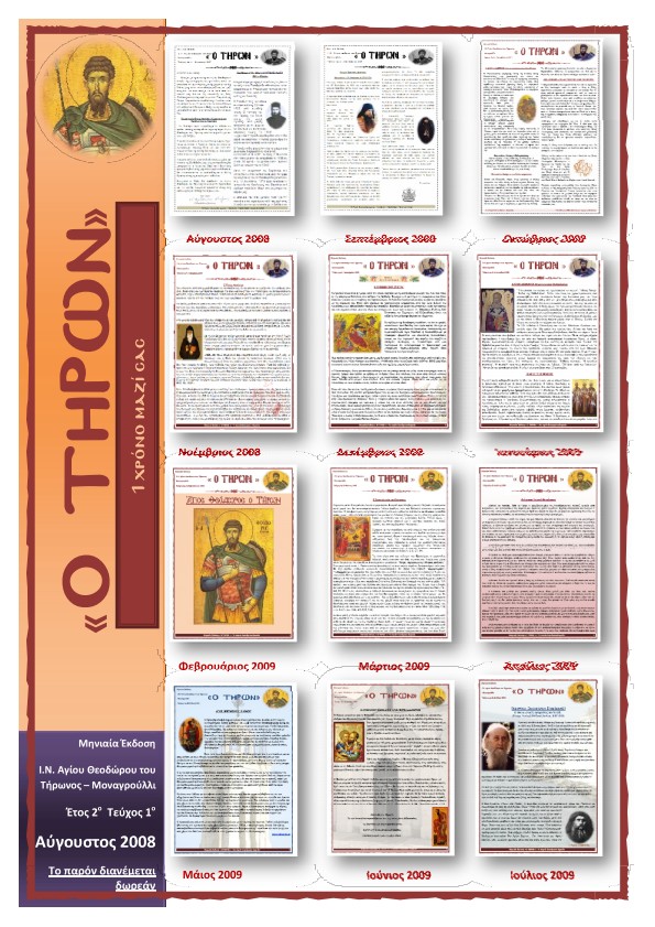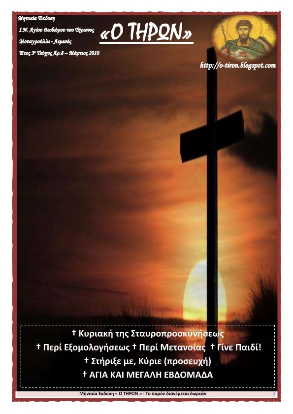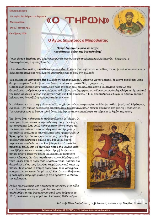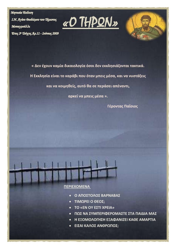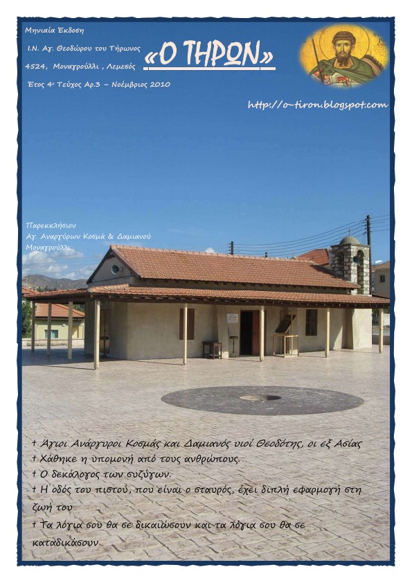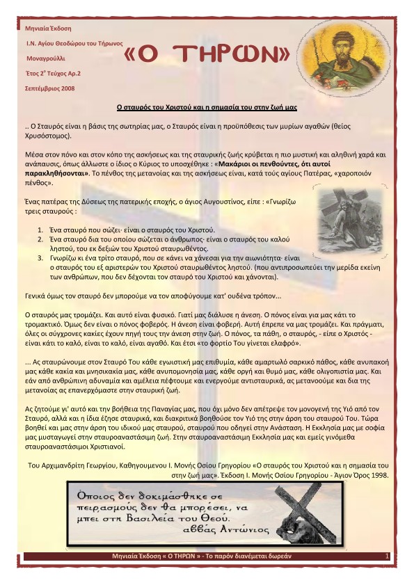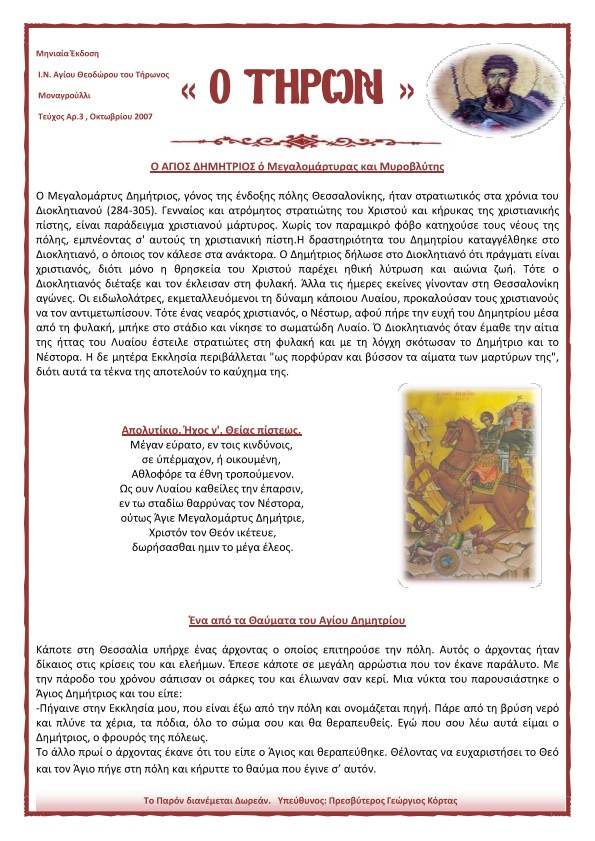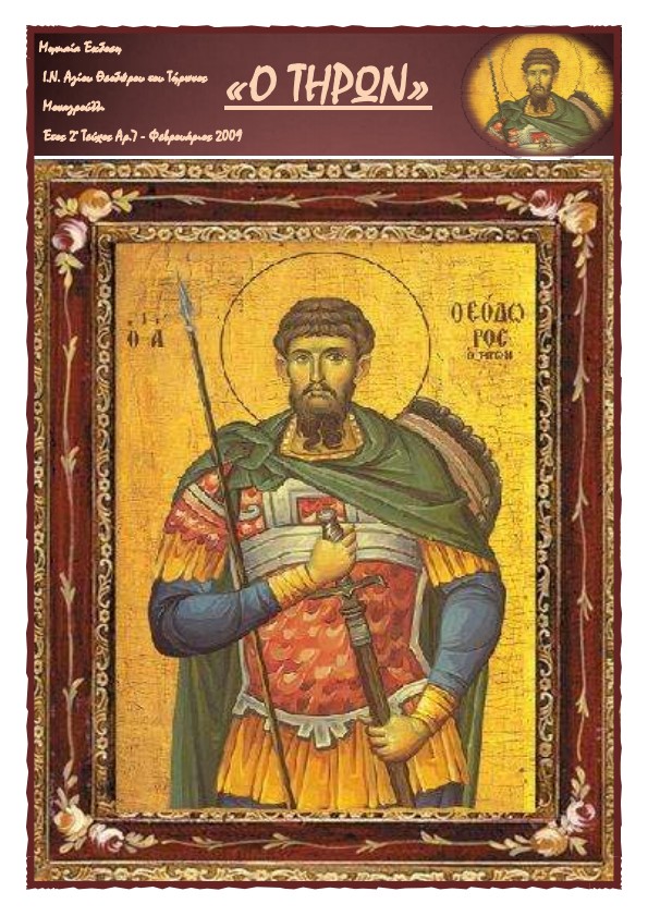 Εύχομαι με τις ευλογίες του Αγίου Θεοδώρου η έναρξη της κυκλοφορίας του φυλλαδίου αυτού να αποτελέσει την αρχή της πνευματικής μας επικοινωνίας. Στόχος μας, είναι να ενωθούμε